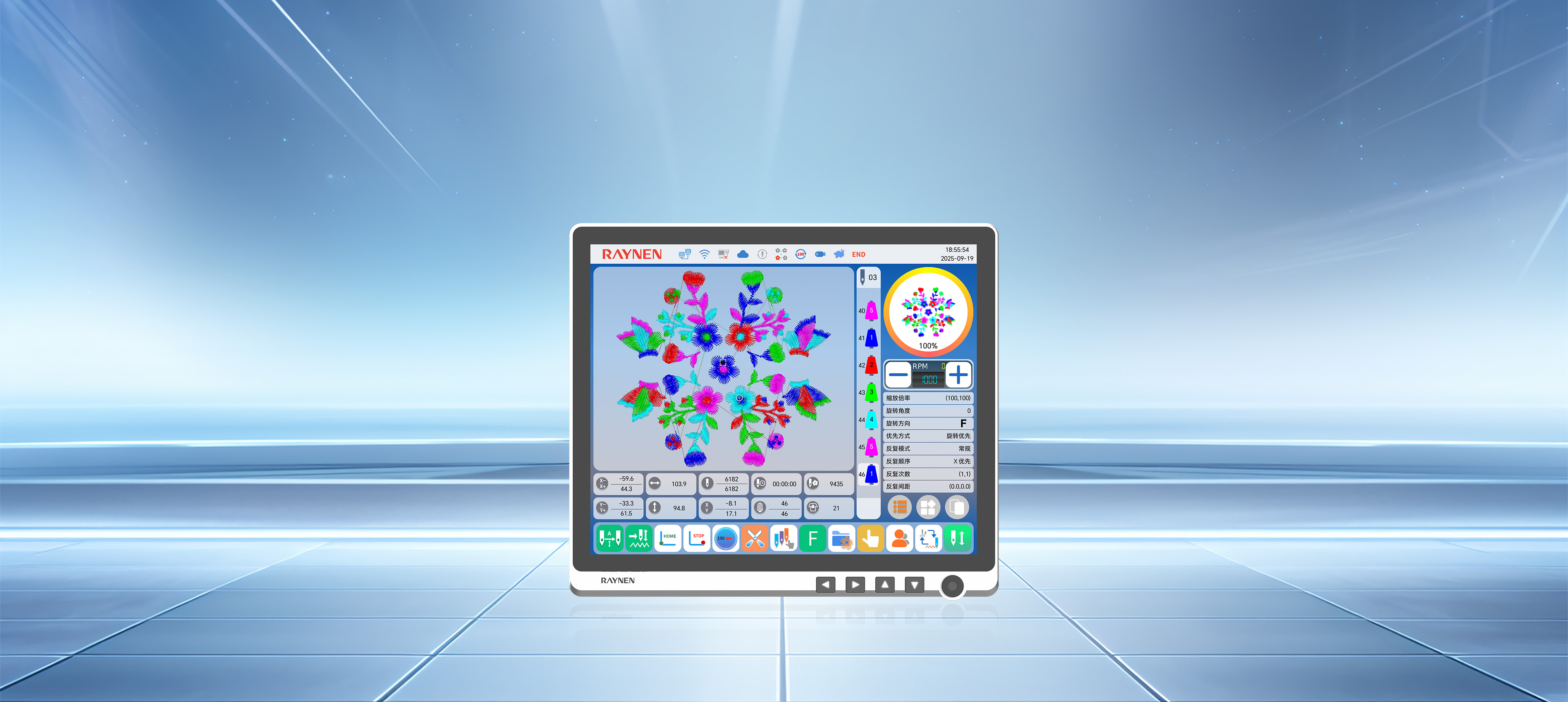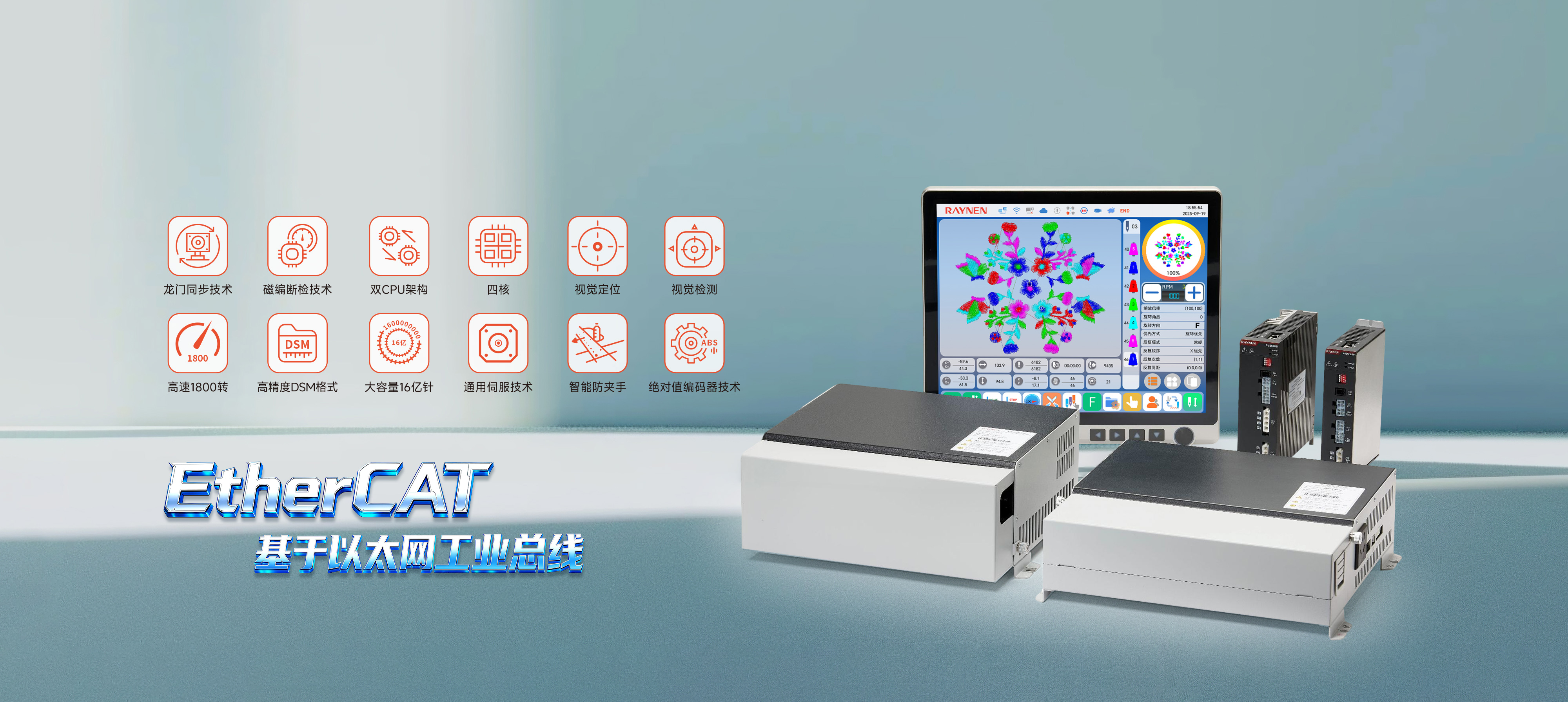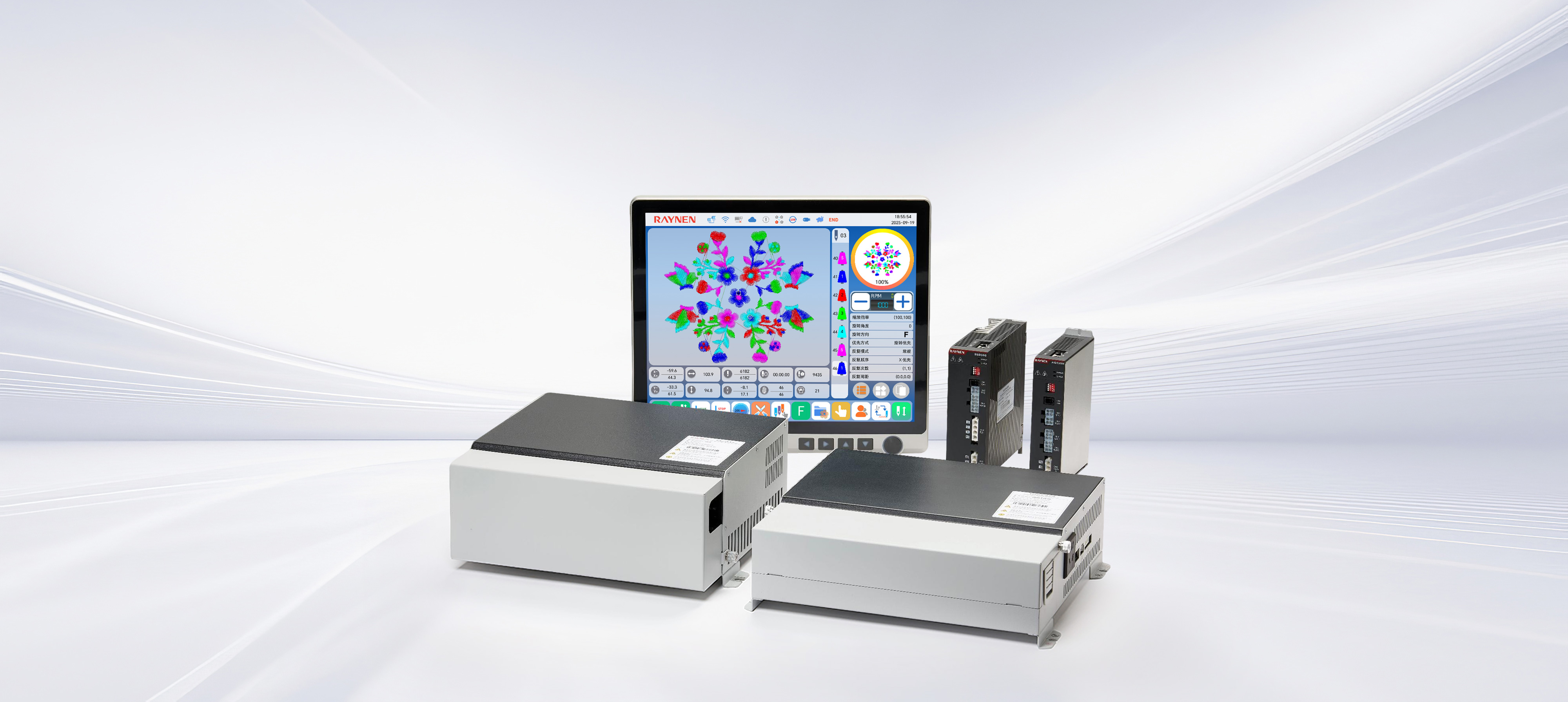 S600系列刺繡機電控系統通過緊湊的機身設計、標準化部件應用,提升了空間利用率和設備維護便捷性,降低了運營成本。其無線操作屏、高精度絕對值編碼器伺服控制系統、全新通用專機伺服等技術創新,不僅提高了生產效率和產品質量,還通過移框智能防夾設計、安全光幕和高清顯示屏增強了設備的安全性和操作性。同時,配置了智慧工廠網絡管理接口,實現了設備的遠程智能化管理,并在精度控制上達到行業領先水平。